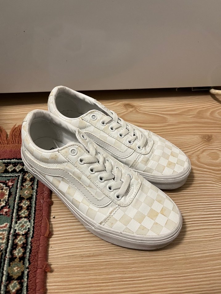 Beyaz kareli desenli, blok topuklu kadın spor ayakkabısı. Kauçuk tabanlı, minimalist ve şık sokak stili için uygundur.