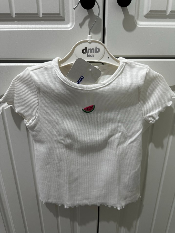 Pamuk kumaştan yapılmış, kısa kollu ve bisiklet yaka, fitted kesim beyaz kız tişörtü. Önünde küçük karpuz baskısı bulunur.