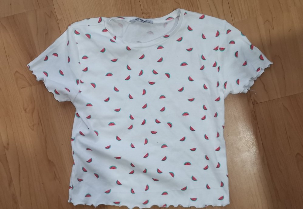 Beyaz, küçük karpuz desenli kız tişörtü. Kısa kollu, yuvarlak yaka ve fırfır detaylı. Rahat kalıp ve yumuşak sentetik kumaş içerir.