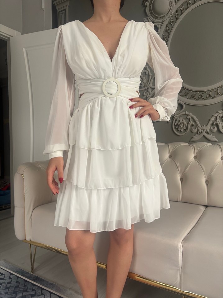 Uzun şeffaf kollu, kemerli ve kat kat etekli beyaz mini elbise. V yaka ve bol kesim, düğünler için uygun.
