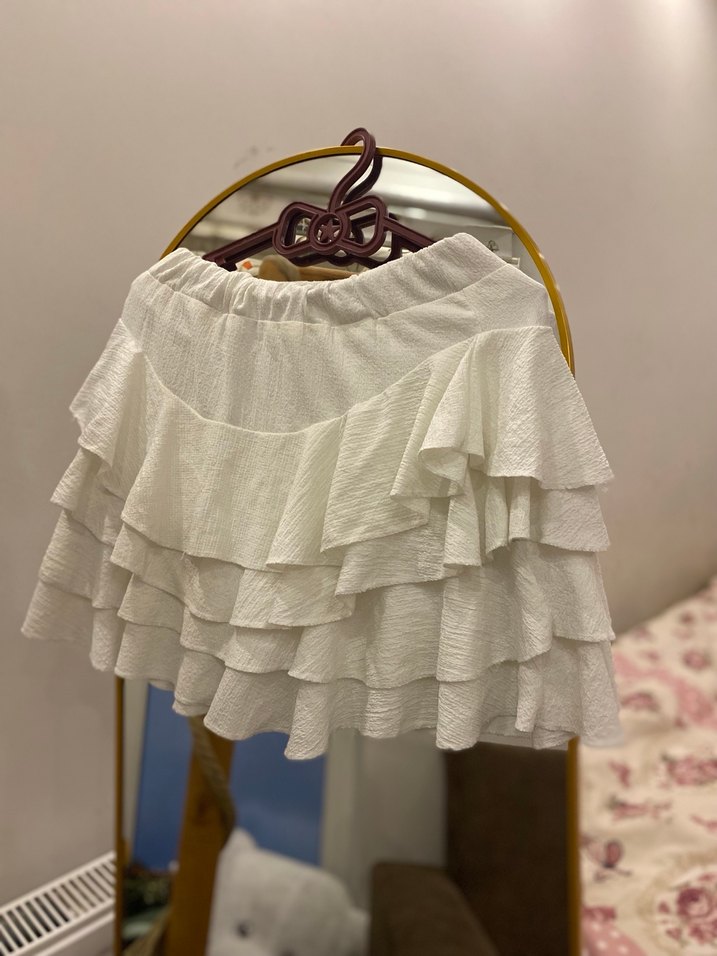 Beyaz keten şortlu mini etek, kat kat fırfır detayları ve nakışlarla bohem tarz sunar. Bol kesimiyle günlük kullanıma uygundur. M ve S beden olur