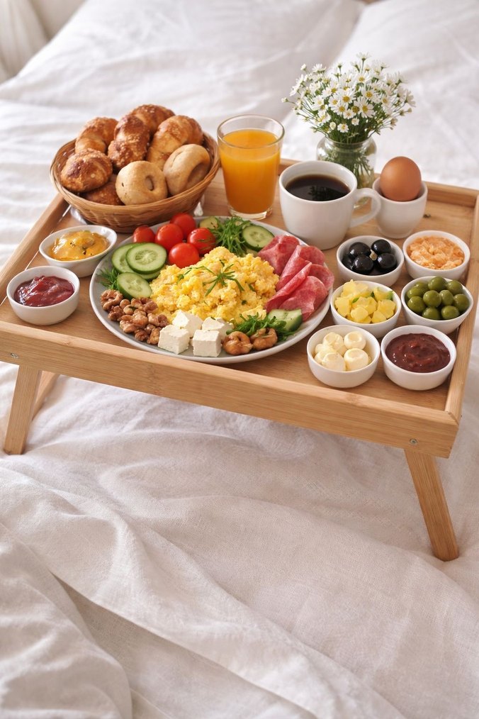 Katlanabilir ayaklara sahip beyaz ahşap kahvaltı tepsisi, yatakta veya kanepede rahat servis için uygundur. ️