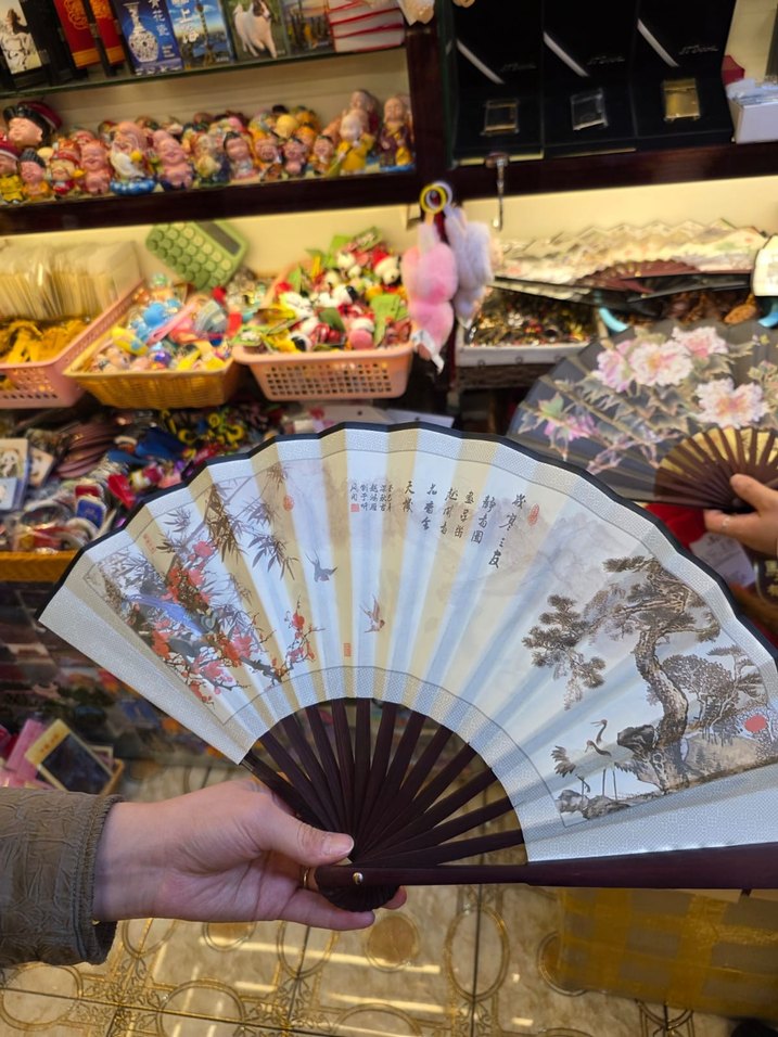 Doğal manzaralar ve kaligrafi içeren beyaz katlanabilir yelpaze, dekoratif veya kişisel kullanım için uygundur.