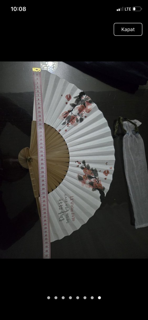 Çiçek desenli beyaz katlanabilir el yelpazesi, ahşap kaburgalı. 'LXVisi2030' yazılı ve koruyucu kılıfı ile birlikte. Hepsi el yapımı ve ahşap. Made in Korea