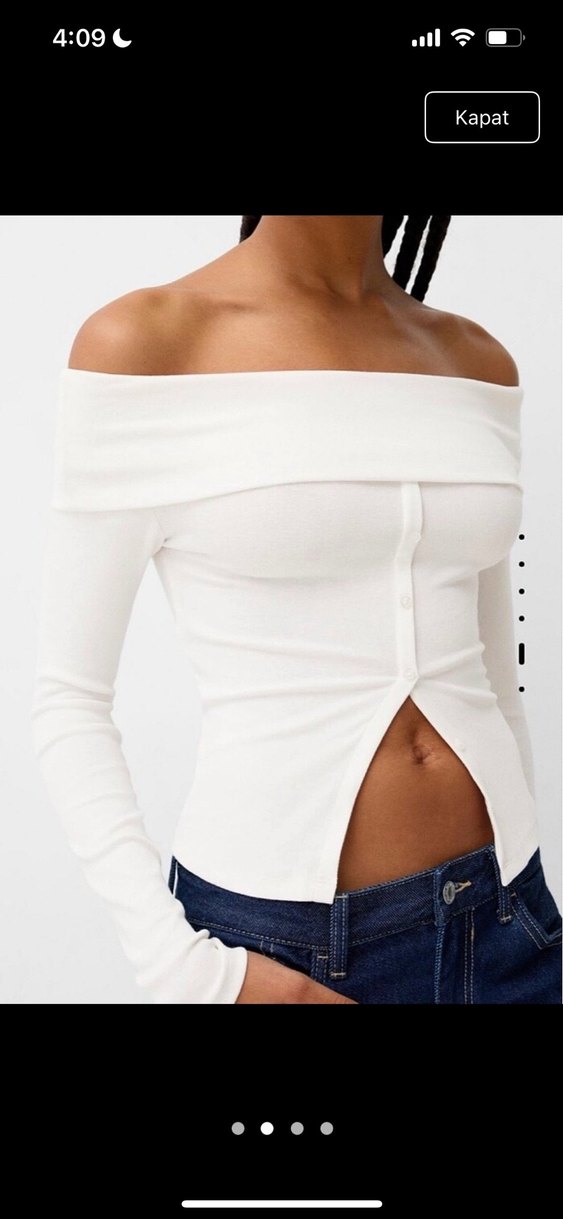 Beyaz kayık yaka, uzun kollu ve düğmeli pamuk bluz. İnce ve vücuda oturan kesimiyle günlük sokak stiline uygundur.