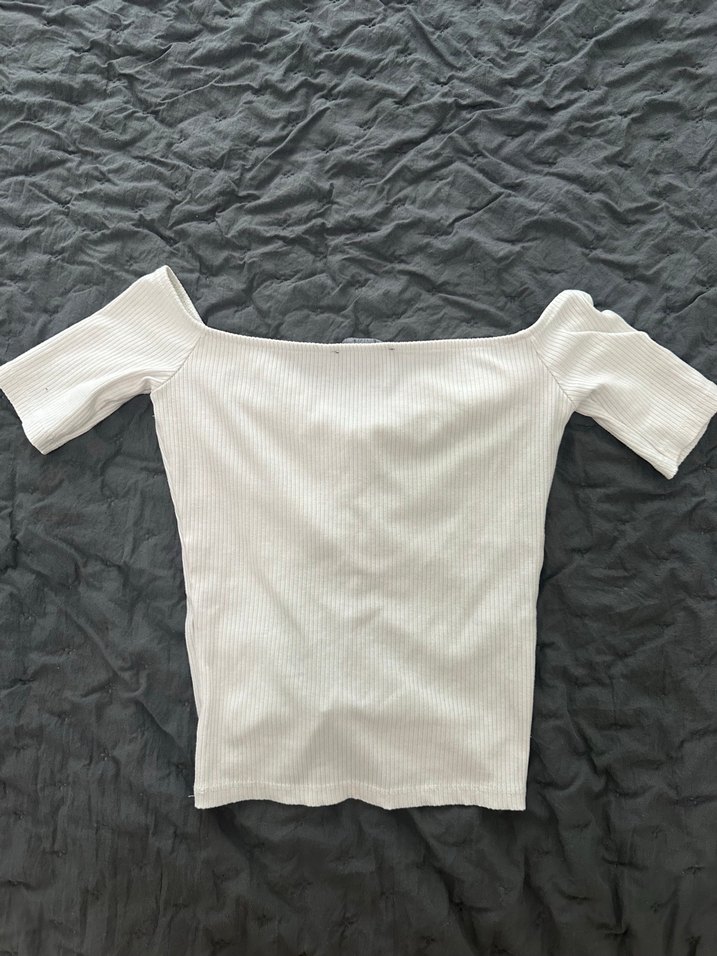 Kayık yaka ve kısa kollu, vücuda oturan beyaz kadın tişörtü. Yumuşak sentetik kumaştan üretilmiş, sade ve minimalist tarzda, günlük kullanıma uygun.