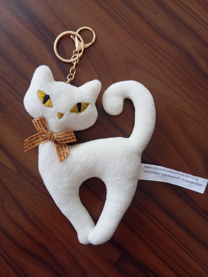 Bohem ve retro tarzda, beyaz kedi şeklinde, yumuşak dokulu ve bağcıklı fiyonk detaylı anahtarlık. #kedi #anahtarlık