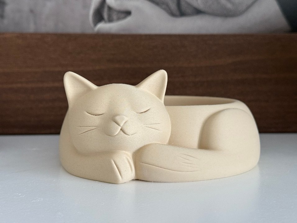 Pastel beyaz renkte, uyuyan kedi figürlü seramik mama kabı. Pürüzsüz yüzeyli ve sevimli bir tasarıma sahip. Kendi üretimimizdir, 3d baskiyla oluşuyor.