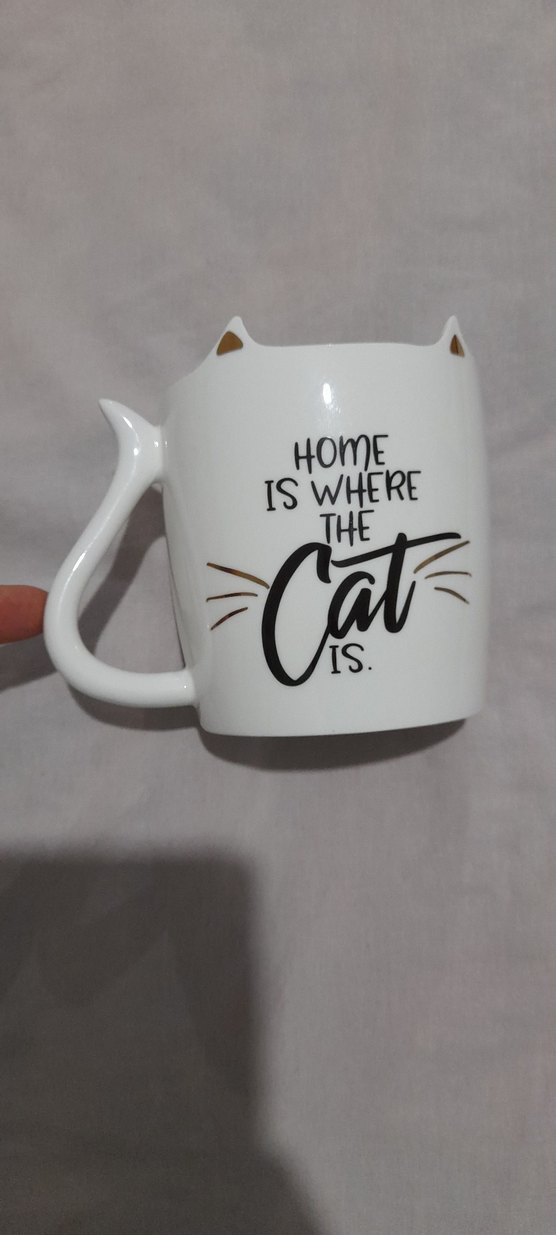 Üzerinde "Home is where the cat is" yazısı ve renkli kedi kulakları bulunan beyaz porselen kupa. sıfır üründür