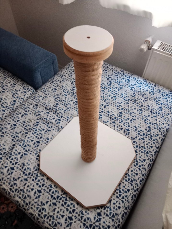 Beyaz renkli, sağlam tabanlı ve doğal ip sarılı tırmalama direği.