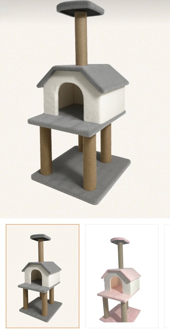 Yumuşak kumaş kaplı beyaz kedi tırmalama evi, merdiven ve tırmanma direği içerir. Kediler için rahat bir saklanma ve oyun alanı sağlar.