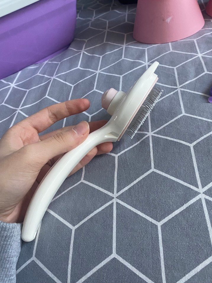 Beyaz renkte, ince metal kıllara sahip kedi tüy bakım fırçası. Tüyleri nazikçe tarayarak bakım sağlar. 2 tane pembe yemek kabı .