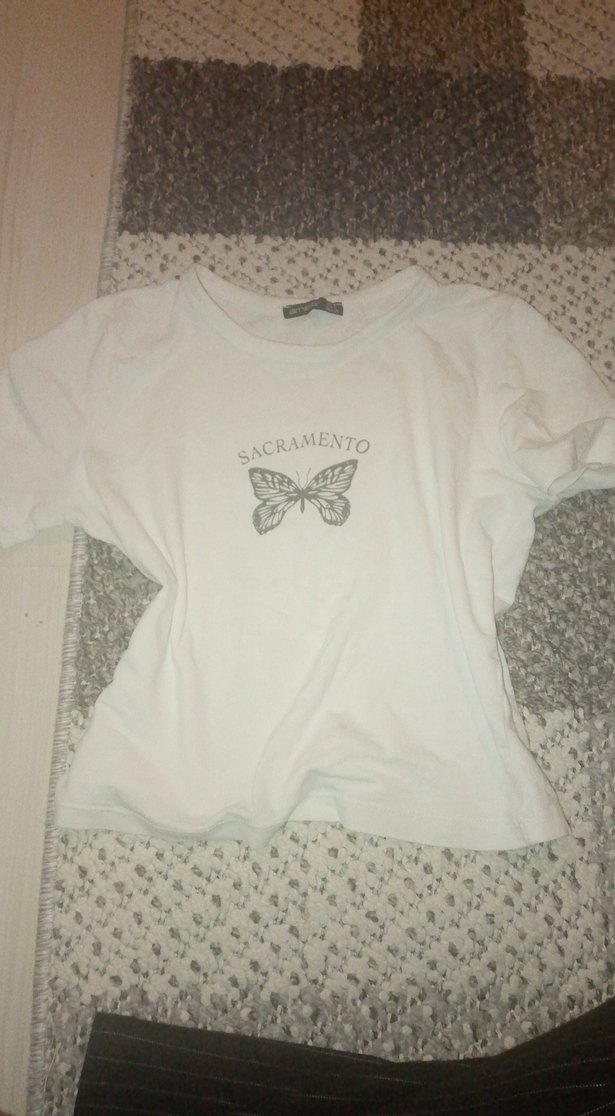 Beyaz crop, üzerinde gri kelebek ve 'SACRAMENTO' yazısı bulunur. Kısa kollu, yuvarlak yaka ve pamuklu kumaştan, rahat kesimlidir.