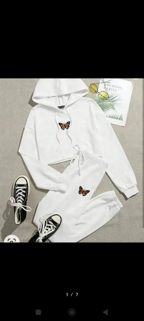 Beyaz kapüşonlu sweatshirt ve eşofman altı, kelebek baskılı, rahat kesim ve yumuşak, sıcak kumaştan üretilmiştir.