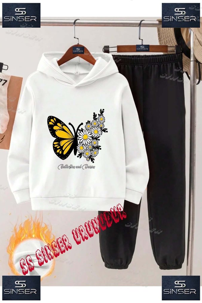 Beyaz Kelebek Baskılı Kapüşonlu Sweatshirt ve Siyah Eşofman