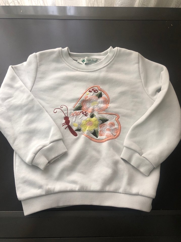 Yumuşak kumaştan, beyaz, uzun kollu, bisiklet yaka, bol kesim kız sweatshirtü. Önünde renkli örme kelebek baskısı bulunur.