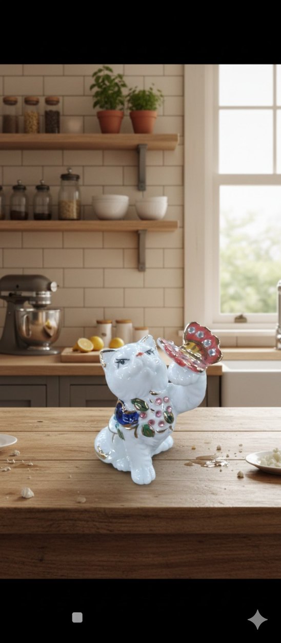 Çiçek detaylı, renkli kelebek tutan beyaz kedi biblosu, sergilemek için uygundur.