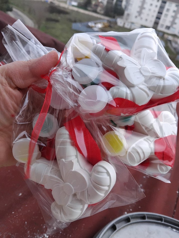 Kelebek şeklinde beyaz parti süsleri, şeffaf poşetlerde kırmızı kurdele ile paketlenmiş, renkli detaylara sahip.