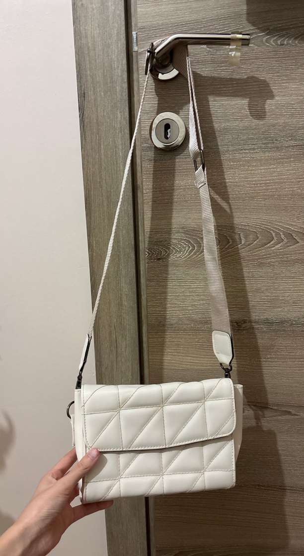 Beyaz kemer detaylı, ayarlanabilir askılı, sentetik kumaştan kadın çantası. Günlük kullanıma uygun, trend sokak stili için ideal.