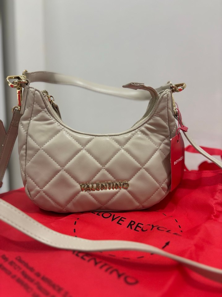 Bej renk, kemer detaylı, baskılı sentetik kumaştan kadın omuz çantası, sokak stiline uygun. Valentino orjinal çanta etiketlidir Boyner den alındı hiç kullanmadım