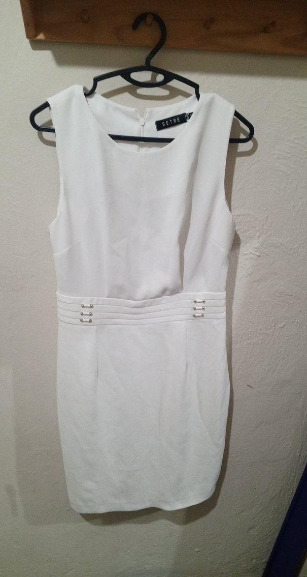 Beyaz, kolsuz midi elbise, kemer detaylı ve straplez yakalıdır. Modern klasik tarzda, ofis için uygun, parlak ve minimalist şıklık sunar. hiçbir kusuru yok sadece dolap fazlası olduğu için satıyorum
