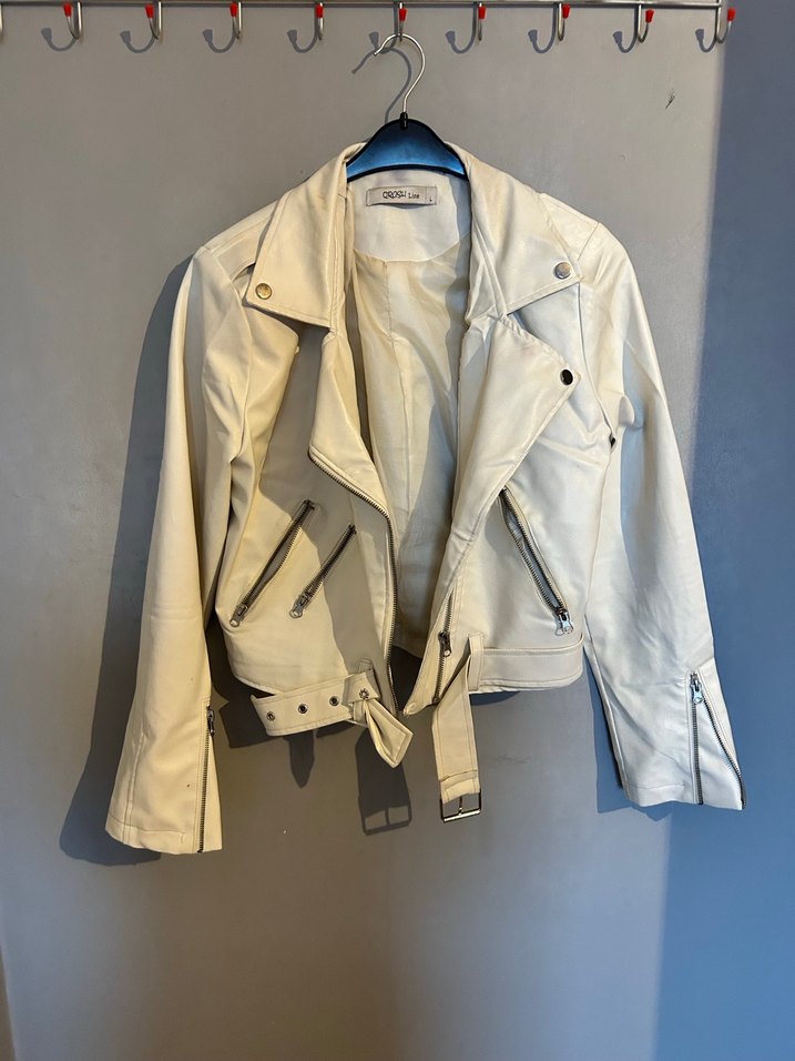 Beyaz deri ceketin kemerli beli, kesik yaka ve askılı kolları vardır. Normal boy ve regular kesimdir. Günlük kullanıma uygundur.