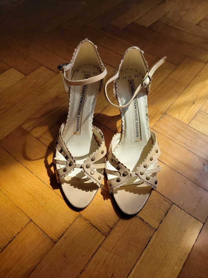 Beyaz deri, kemerli dolgu topuklu kadın abiye ayakkabılar, parlak yüzeye sahip, düğünler için uygun.
