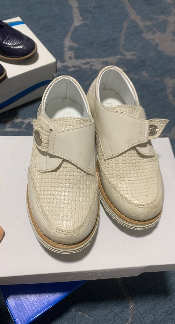 Beyaz, parlak yılan desenli, kemerli, kauçuk malzemeden yapılmış erkek özel gün ayakkabısı. Geleneksel tarzda, klasik görünümlü.
