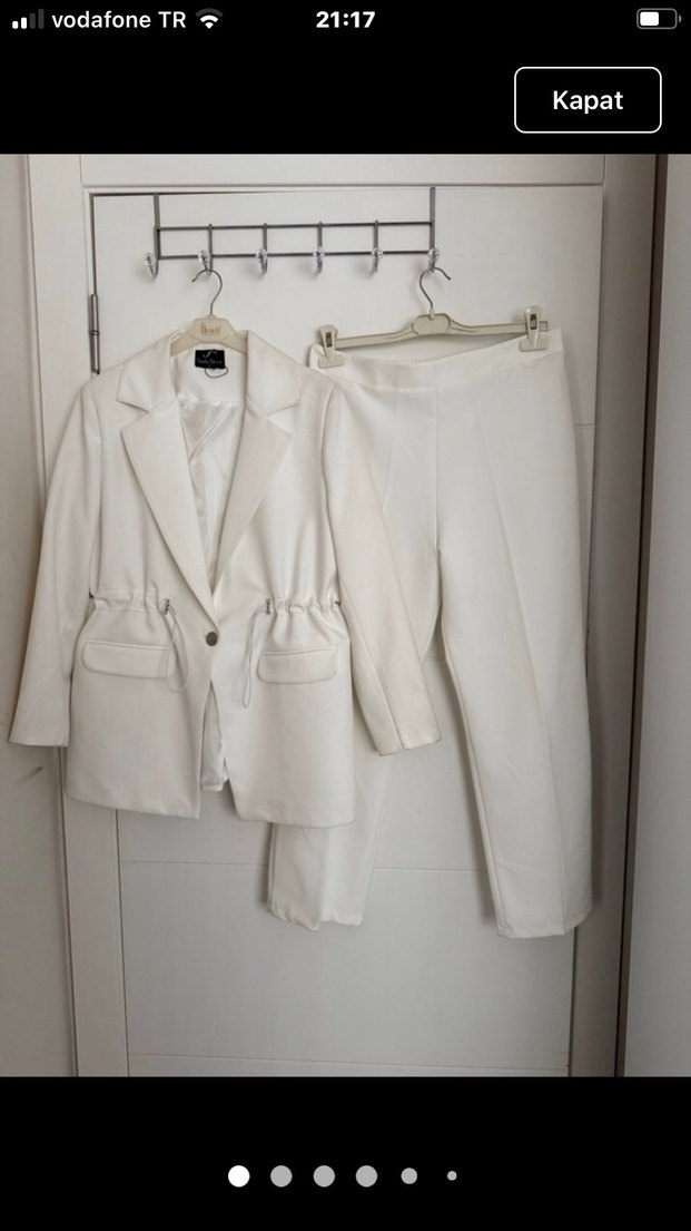 Beyaz renkli, kemerli ve kesimli yakalı kadın blazer ceket ve pantolon takımı. Sentetik kumaştan, ofis ve sokak stiline uygun şık parça. ✨