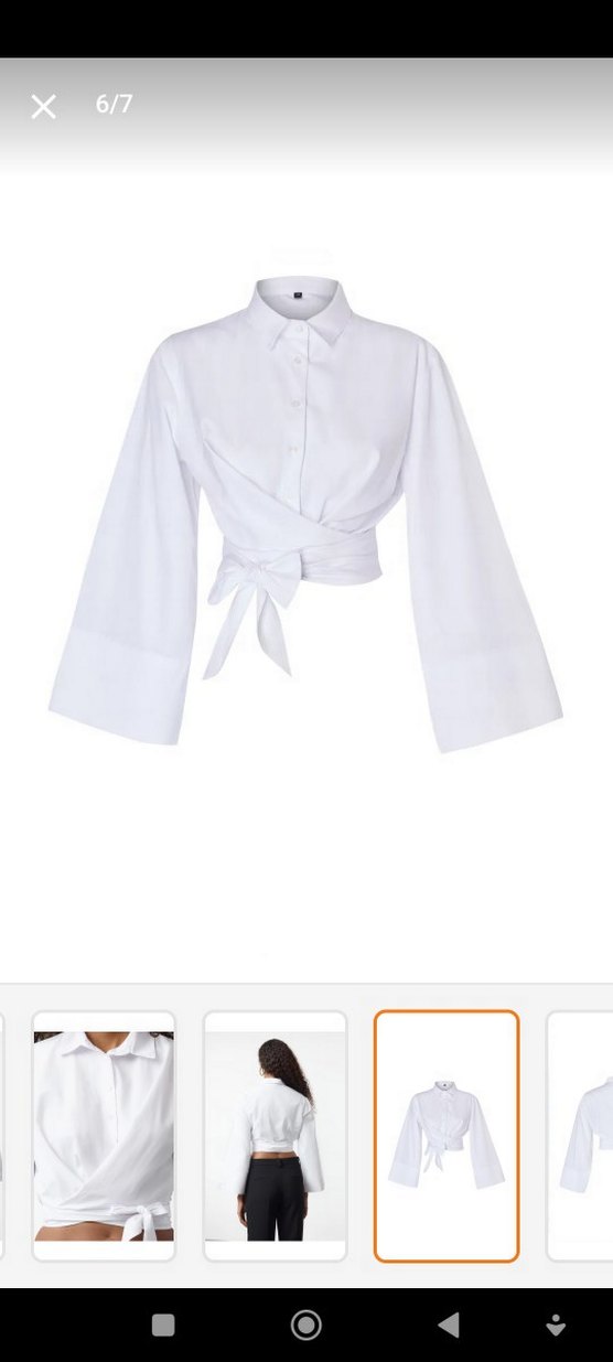 Beyaz pamuklu, kemerli ve kısa kesim kadın gömlek. Kayık yaka ve askılı kollarıyla minimalist, ofis için uygun rahat kesim.