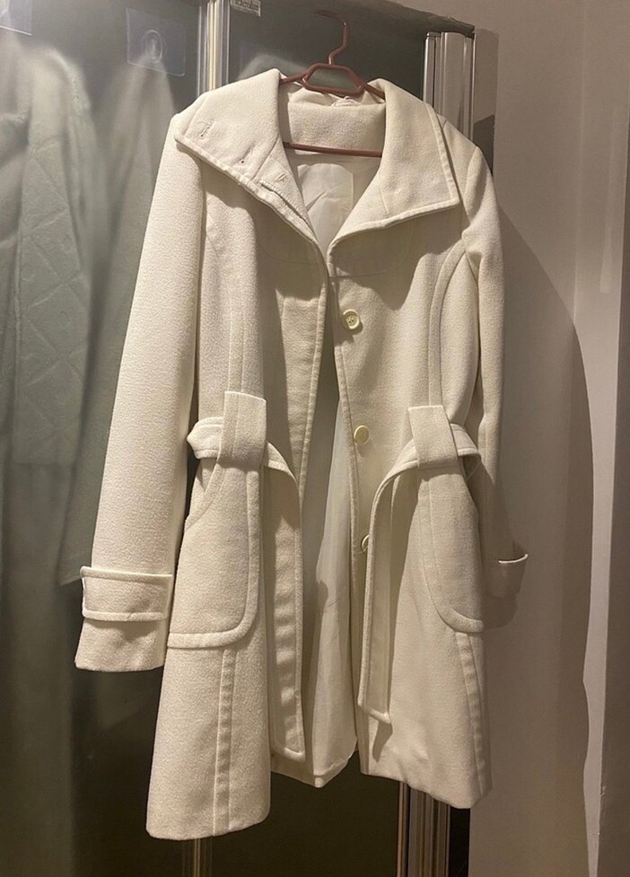 90 cm Beyaz, kemerli ve büyük cepli kadın kaban. Geniş yakalı ve düğmeli, uzun kolludur. ❄️