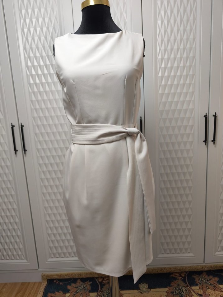 Beyaz, kemerli, kolsuz kalem elbise, tek renk ve tekne yaka. Orta boy ve klasik kesim, iş ortamına uygundur.