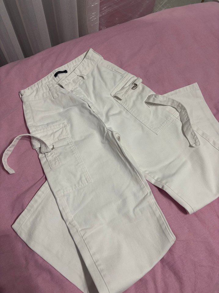 Pamuk beyaz midi uzunlukta, bol kesim kadın pantolon, kemerli ve desenizdir. Günlük sokak stili için uygundur.