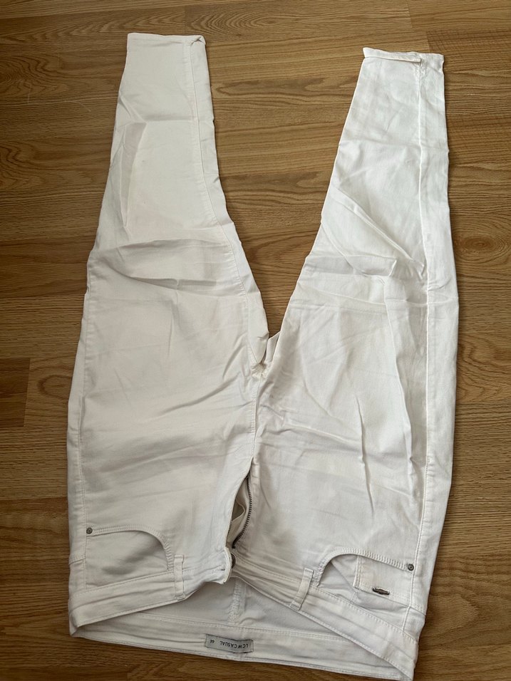Beyaz keten kumaştan, kemerli, vücuda oturan midi uzunlukta kadın pantolonu. Minimalist sokak stili için uygundur.