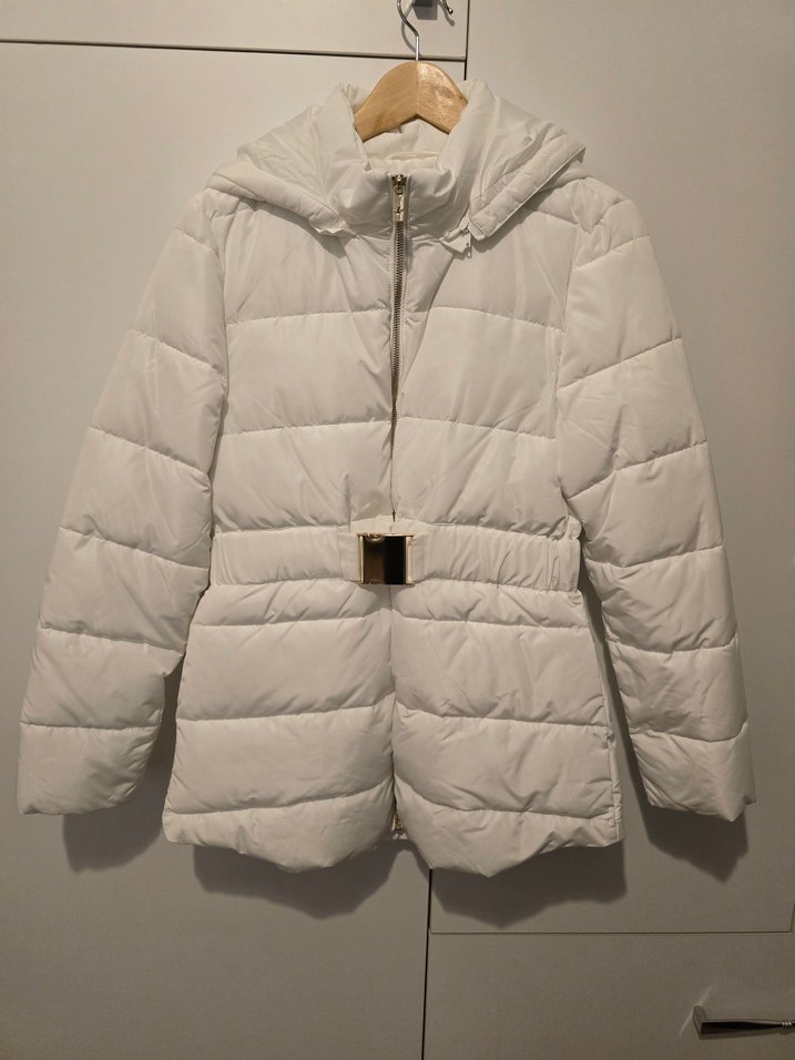 Beyaz renkte, kemerli ve beli oturan kesime sahip kadın kışlık mont. Yumuşak ve sıcak kumaştan, günlük kullanıma uygun rahat ve şık bir sokak stili sunar. Orta uzunlukta ve askılı kolludur. ❄️Kapşonu çıkabiliyor,etiketi yok ama kullanılmadı,sarı tokasının jelatini üstünde duruyor