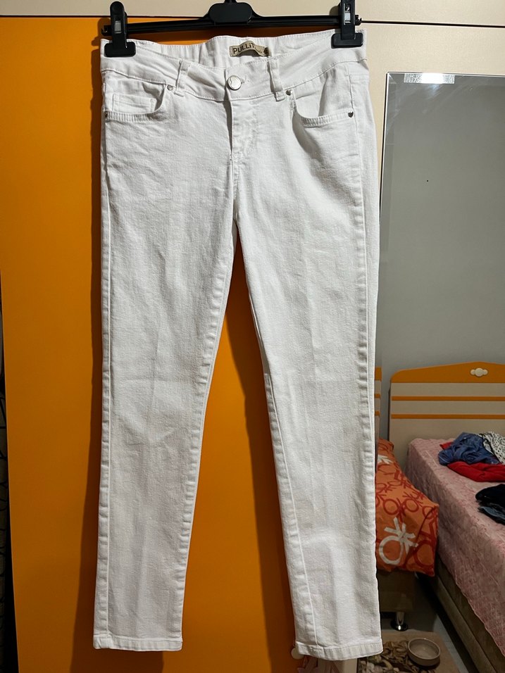 Beyaz renk, kemerli ve normal boy düşük bel kadın kot pantolon. Rahat kesimiyle günlük kullanıma uygundur. Hiç giyilmedi, temiz ve hasarsızdır.