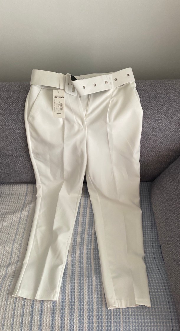 Beyaz, kemerli kumaş pantolon, normal boy midi kesim ve regular fit. Satenimsi dokusu ve desen içermeyen tasarımıyla ofis için uygun, trend şık bir parça.