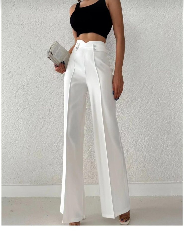 Beyaz Kemerli Kadın Kumaş Pantolon