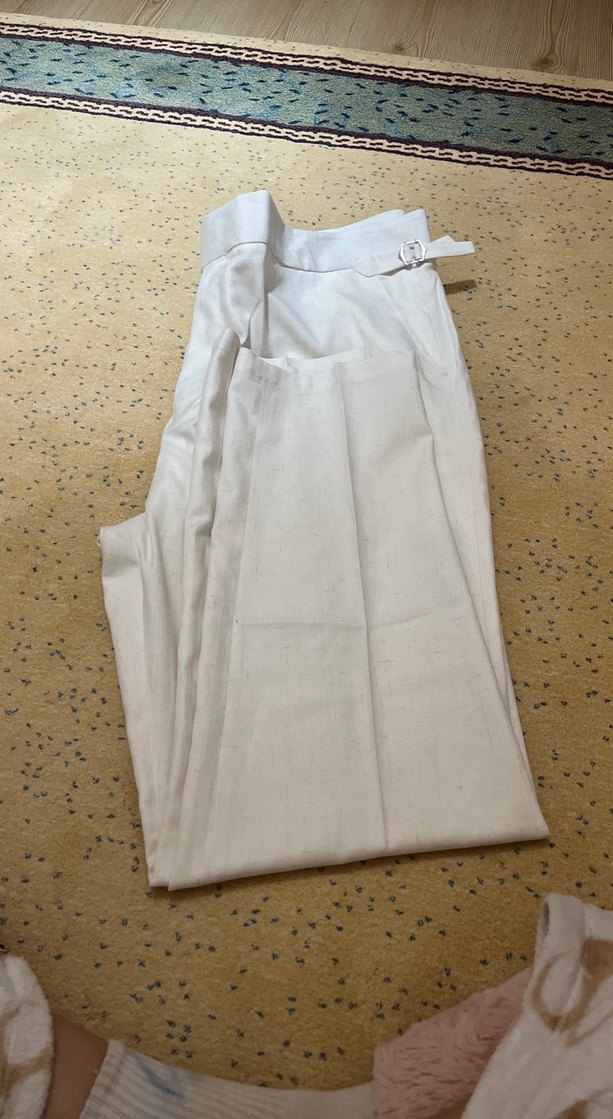 Beyaz keten kumaştan, kemerli ve normal kesim kadın pantolon. Midi boy ve sade tasarımıyla ofis için uygundur.