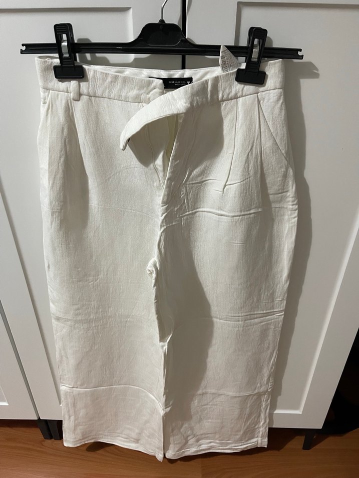 Beyaz keten kumaştan yapılmış, kemerli ve midi boy, regular fit pantolon. Minimalist ve günlük kullanıma uygun rahat bir model. Bedeni küçük geldiği için satıyorum
