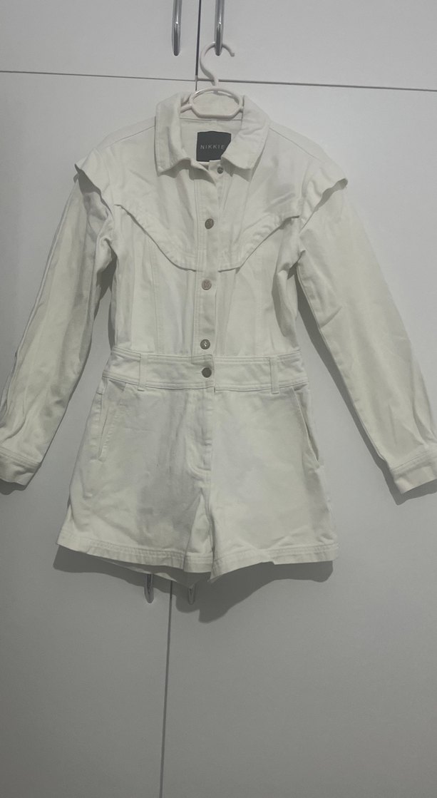 Beyaz keten mini tulum, uzun kollu, kemerli ve dar kesimdir. Notlu yaka detayına sahiptir, sokak stili için uygundur.