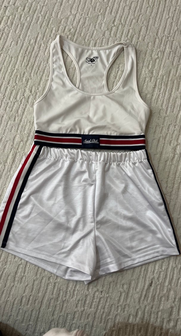 Beyaz, kolsuz kısa tulum, straplez yaka ve kemerli bel detayına sahiptir. Pürüzsüz sentetik kumaştan üretilmiş, spor şerit detaylarıyla athleisure ve streetwear tarzına uygundur. ⚽