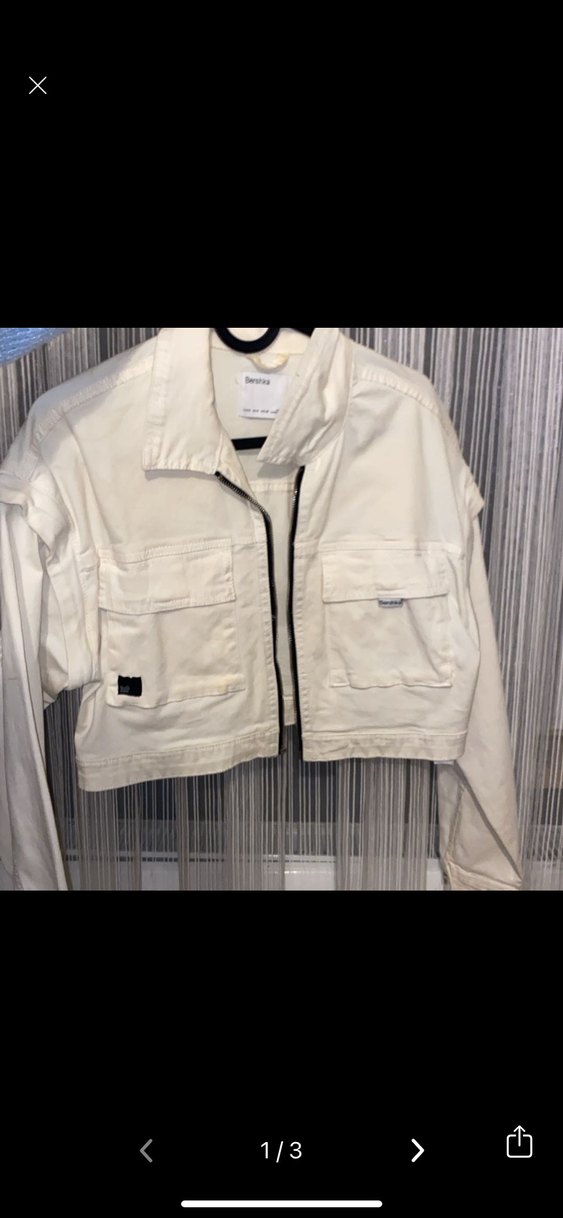 Pamuk kumaştan, kemerli ve uzun kollu, kısa kesim beyaz kadın ceket. Notch yaka detayıyla günlük sokak stiline uygun.