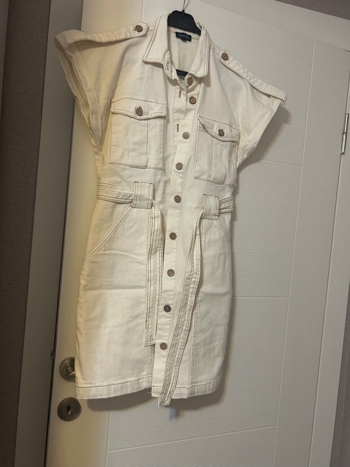 Beyaz denim kumaştan, kısa kollu ve kemerli midi boy elbise. Notlu yaka detayı ve sokak stili görünümüyle günlük kullanıma uygun. Etiketi yok ama hiç kullanılmadı
