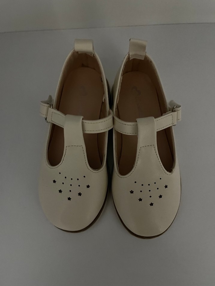 Kemerli bantlı ve yıldız desenli beyaz kız çocuk babet ayakkabısı, yumuşak ve esnek malzemeden üretilmiştir. ✨ sadece bir defa giyildi rahattır