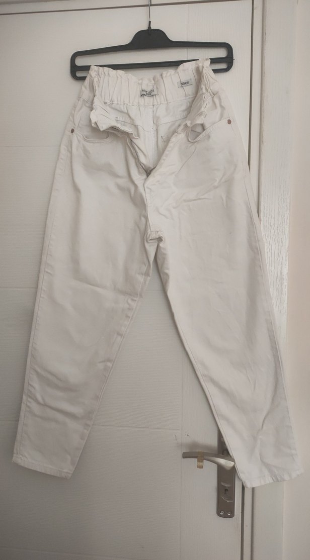 Beyaz keten kumaştan, kemerli ve loose fit midi uzunlukta, gündelik sokak stili için uygun kot pantolon.
