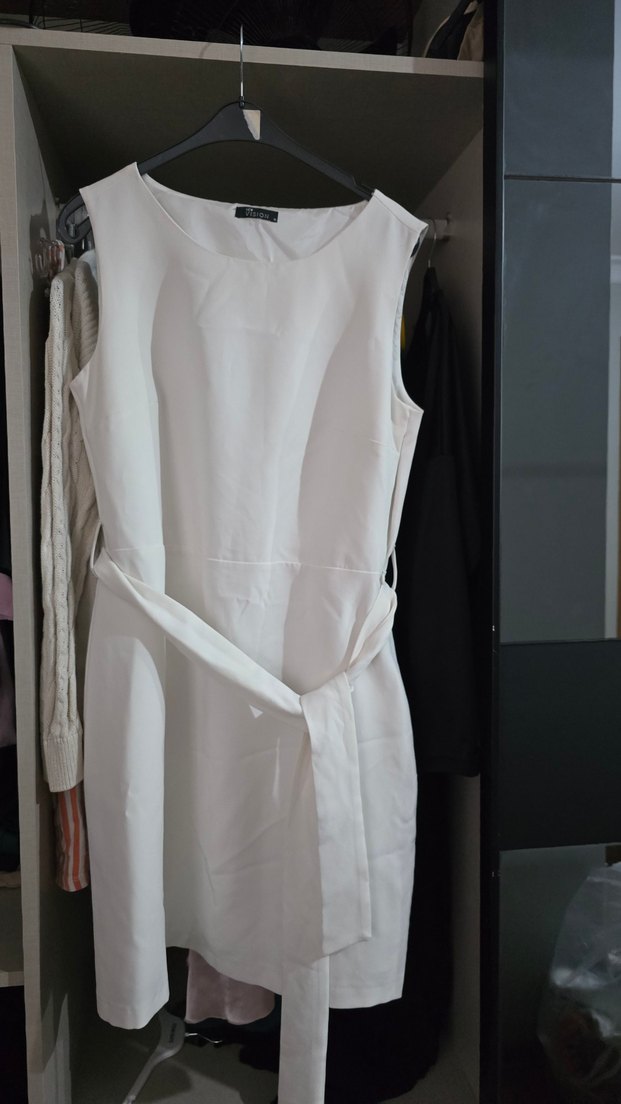 Kolsuz, yuvarlak yaka ve kemerli beyaz midi elbise. Düz ve yumuşak sentetik kumaştan, rahat kesim ve minimalist sokak stiliyle günlük kullanıma uygun.