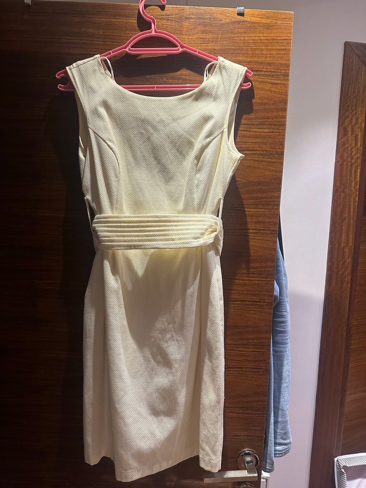 Pamuk kumaştan, kemerli ve askısız beyaz midi elbise. Modern klasik tarzda, ofis için uygun, vücuda oturan kesim.