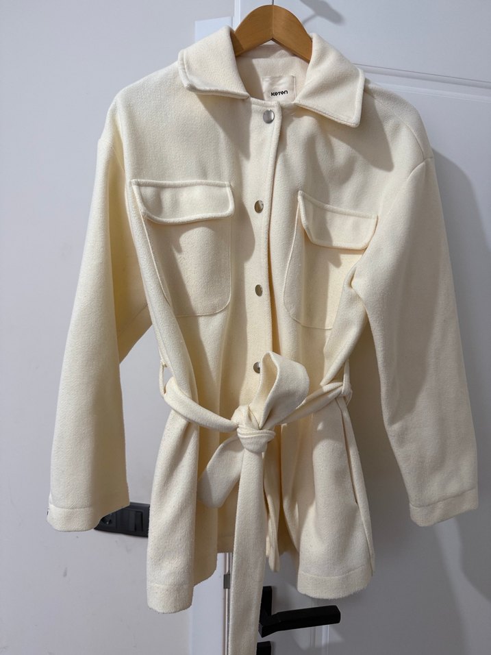 Beyaz, kemerli midi uzunlukta kadın kaban, notlu yaka ve uzun kolludur. Rahat kesimi ve yumuşak, sıcak dokusuyla günlük sokak stiline uygundur. İki ön ceplidir ve desensizdir.
