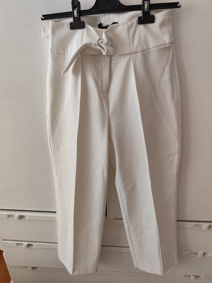 Beyaz pamuk kumaştan, kemerli ve normal kesim midi uzunlukta kadın pantolon. Desensiz, ofis için uygun sade ve basic tarzda.